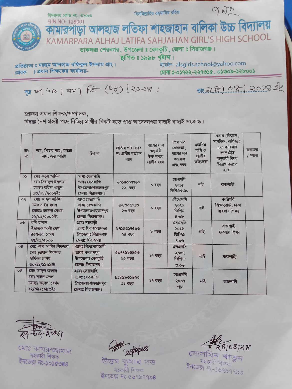 নৈশ প্রহরী পদে বিভিন্ন প্রার্থীর নিকট হতে প্রাপ্ত আবেদন যাছাই বাছাই করে প্রকাশিত।